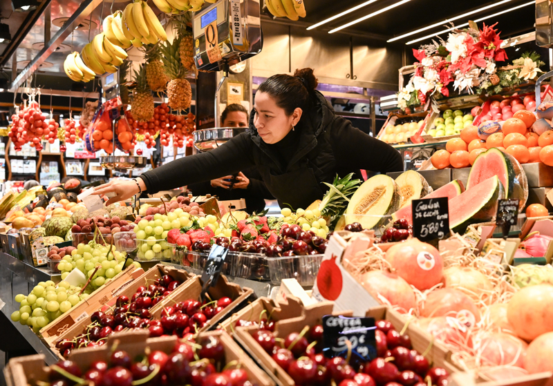 12月2日,摊贩在西班牙巴塞罗那市中心的博凯里亚市场售卖水果。\n 新华社发