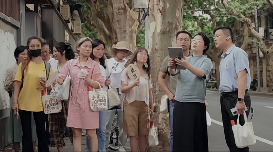 王溪(右二)正在带领市民开展CityWalk活动,了解慎成里及其所在街区的前世今生。