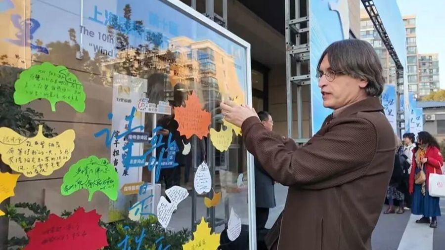 朗诵会前,中外诗人、万里诗社成员、晋元高级中学学生志愿者齐聚苏河码头,开启一场“诗旅融合”的诗歌交流会。《童年河》的篇章朗诵、“半马苏河”沿线地标的精心讲解赏金国际平台,让与会嘉宾领略了黄浦江的风采之后,又体验到了苏州河的秀丽风光与普陀的高质量发展成果。“一江一河”的魅力也点燃了中外诗人的创作热情,大家将即兴创作留在了树叶便签上。活动于主会场入口处设置“诗意墙”,中外诗人的即兴灵感成为片片“诗意留痕”,让诗歌从“纸上”走向“墙上”,让诗意成为万里居民触手可及的生活日常。